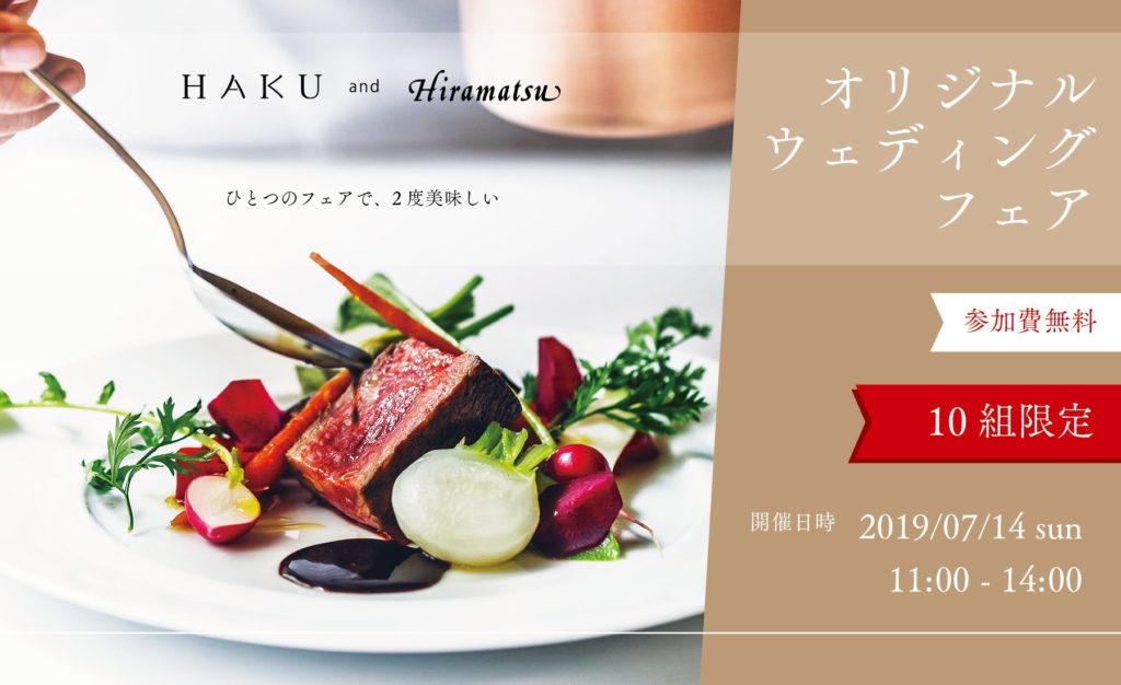 オリジナルウェディングをプロデュースする【HAKU】(運営会社:株式会社スペサン 本社:東京都文京区)は、株式会社ひらまつ(本社:東京都渋谷区)が運営する「レストランひらまつ レゼルヴ」にて、両社が提供するウェディングサービスを体験できるスペシャルフェアを2019年7月14日に協働開催いたします。